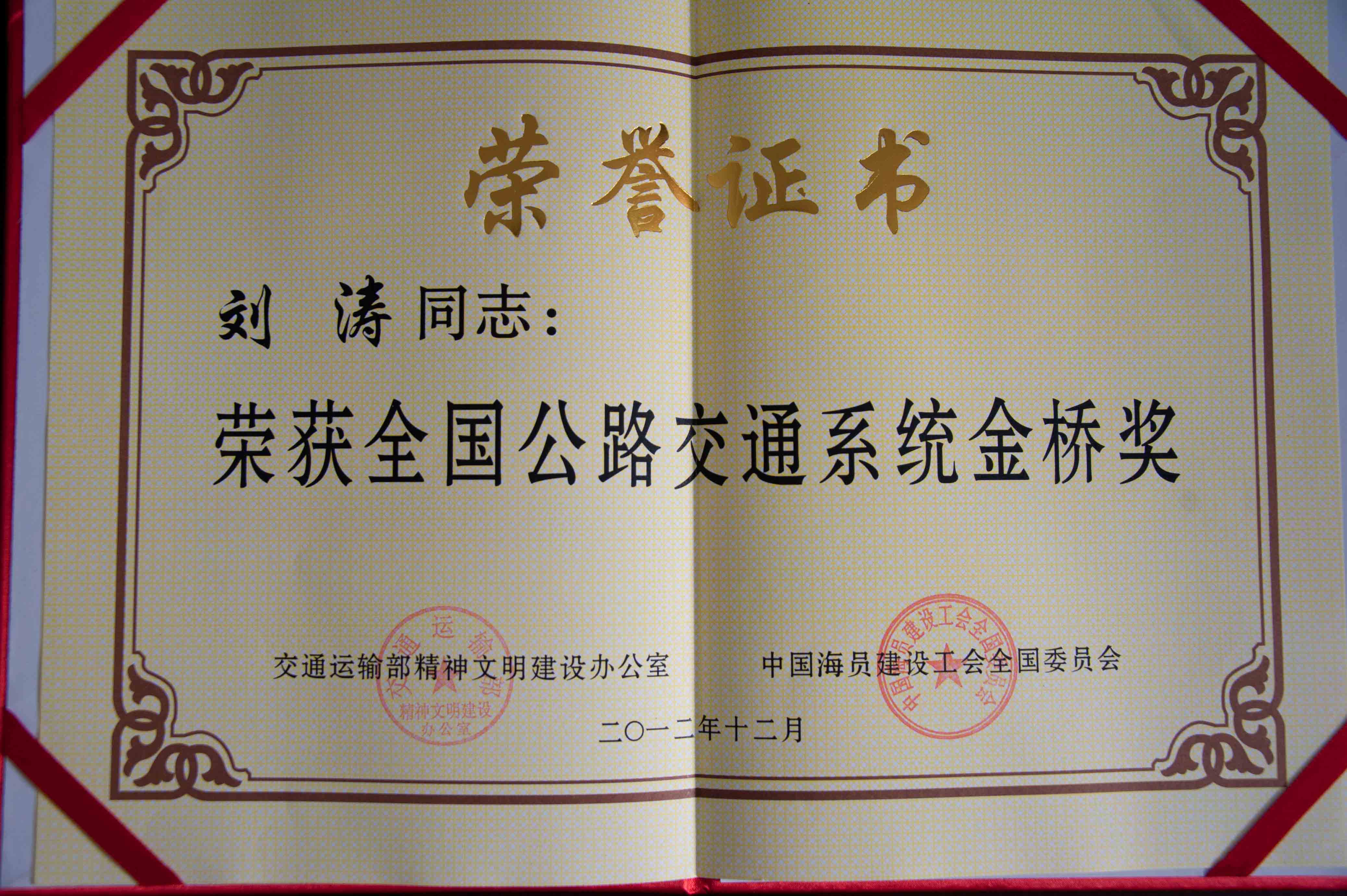 劉濤同志獲“全國公路交通系統金橋獎”