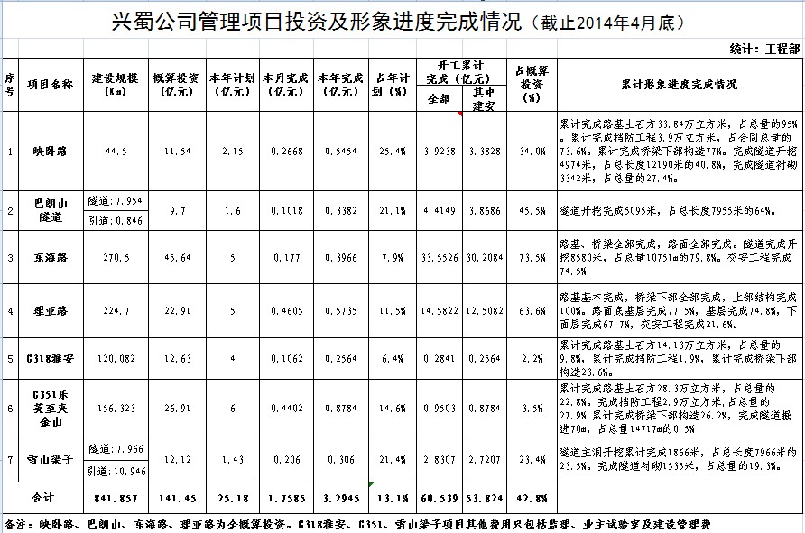 公司管理項(xiàng)目投資及形象進(jìn)度完成情況(截至2014年4月底)