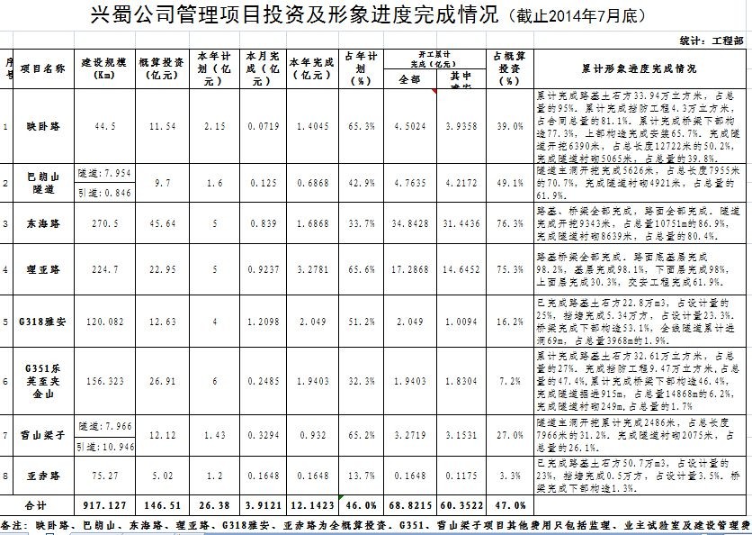 公司管理項目投資及形象進度完成情況(截至2014年7月底)