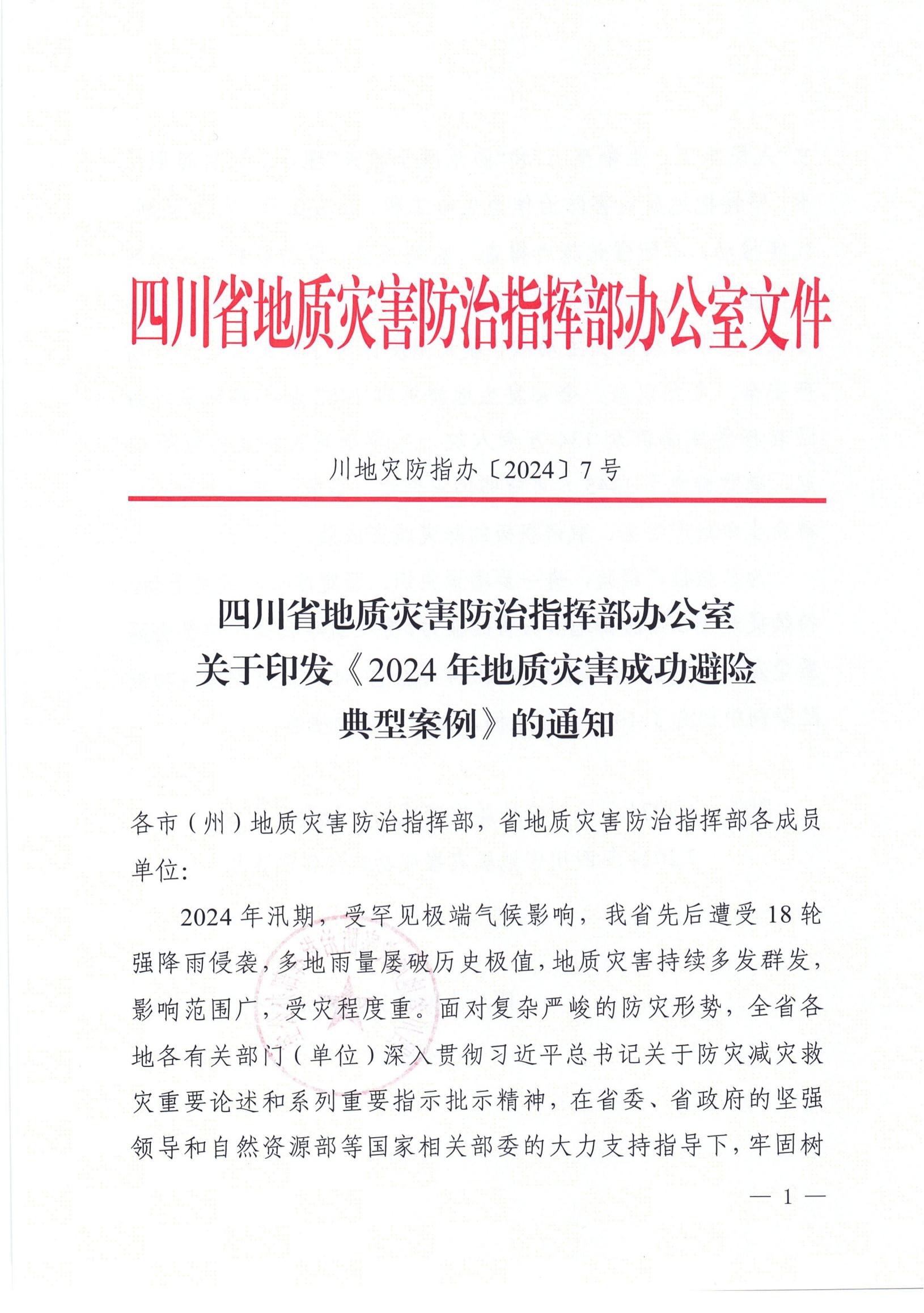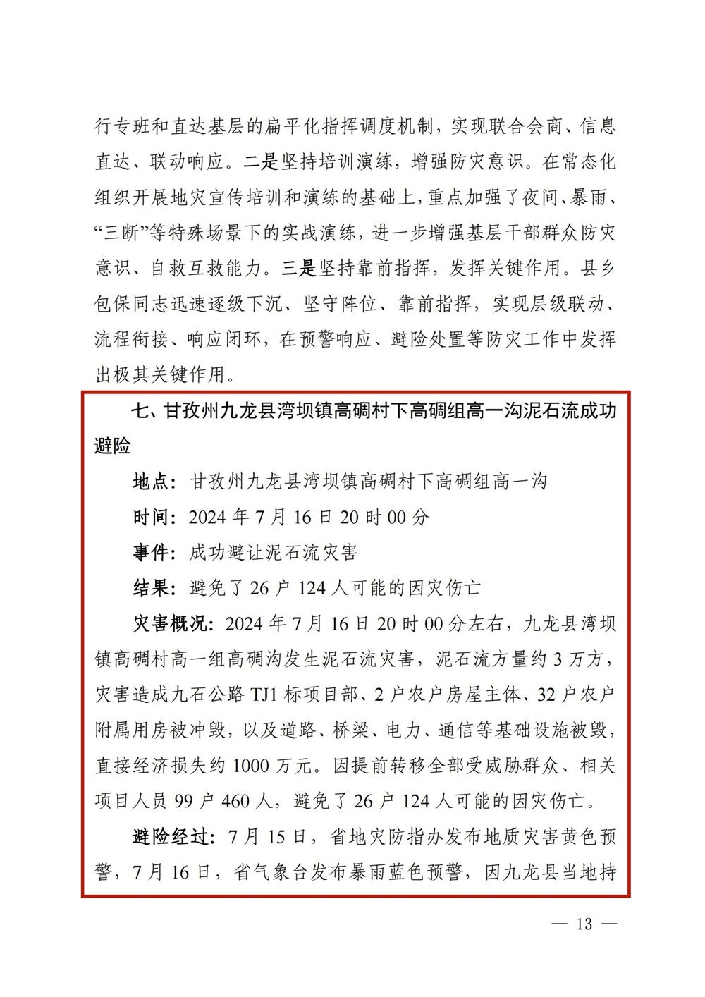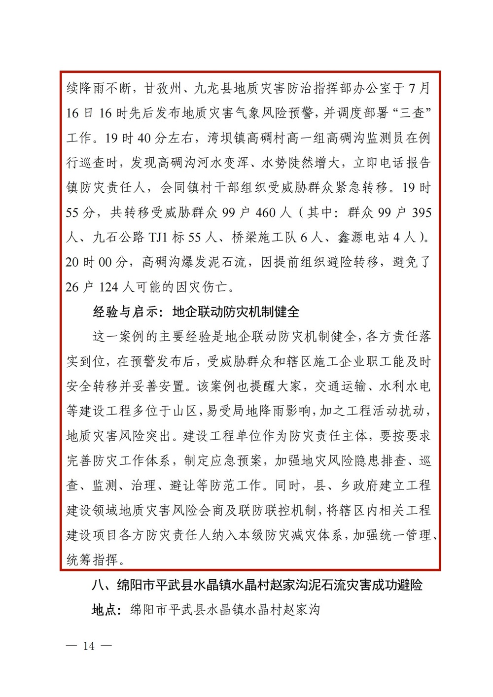 這一案例的主要經驗是地企聯動防災機制健全,各方責任落實到位,在預警發布后,受威脅群眾和轄區施工企業職工能及時安全轉移并妥善安置。該成功避險經驗入選四川省地質災害防治指揮部《關于印發2024年地質災害成功避險典型案例》的通知(川地災防指辦[2024]7號)。