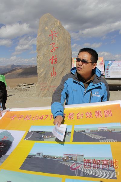 四川興蜀公路公司G318線東海路改建工程項目指揮部指揮長助理楊朝富正在介紹獨具民族特色的卡子拉山觀景臺設計。