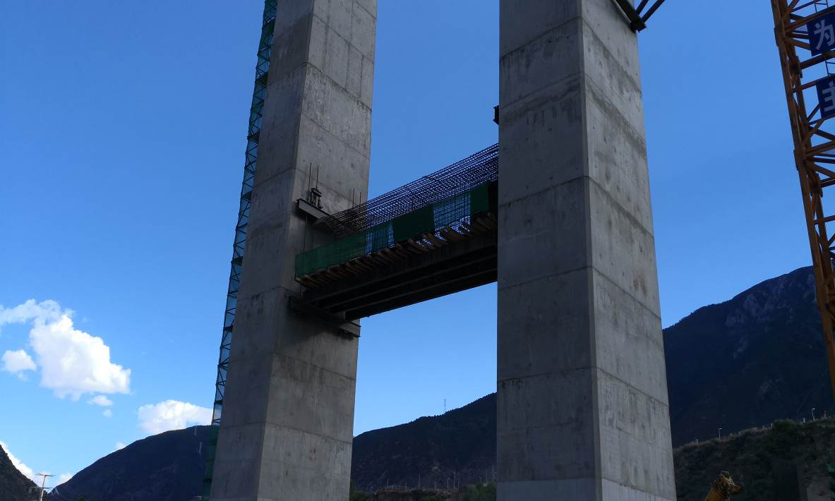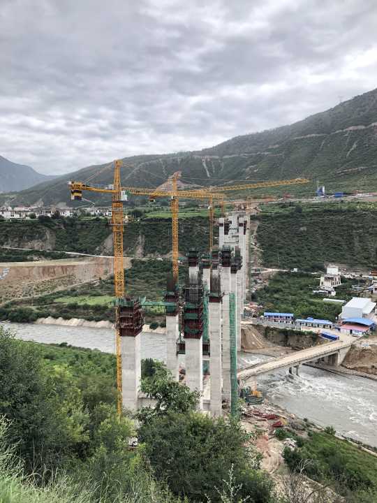考慮到大橋高空作業(yè)難度較大,最高墩柱有81米,9個墩柱為雙柱式空心薄壁橋墩,桑然部指揮部布置了5臺40米到91米高的塔吊,每臺塔吊“分管”1至2個墩柱,先將施工材料運至墩柱下面,采用塔吊吊裝至墩柱面,待墩柱施工完成后,施工蓋梁和架設(shè)預(yù)制梁便開始了。塔吊最“忙碌”的時候,多至9個墩柱同時作業(yè),大大提升了墩柱的施工效率。