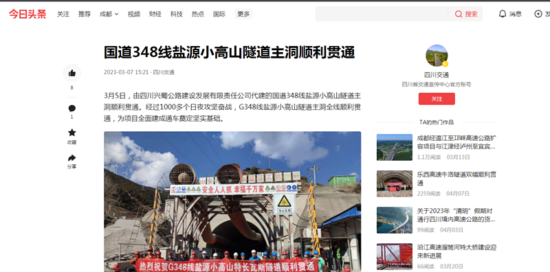 3月5日,由四川興蜀公路建設(shè)發(fā)展有限責(zé)任公司代建的國(guó)道348線鹽源小高山隧道主洞順利貫通。經(jīng)過1000多個(gè)日夜攻堅(jiān)奮戰(zhàn),G348線鹽源小高山隧道主洞全線順利貫通,為項(xiàng)目全面建成通車奠定堅(jiān)實(shí)基礎(chǔ)。