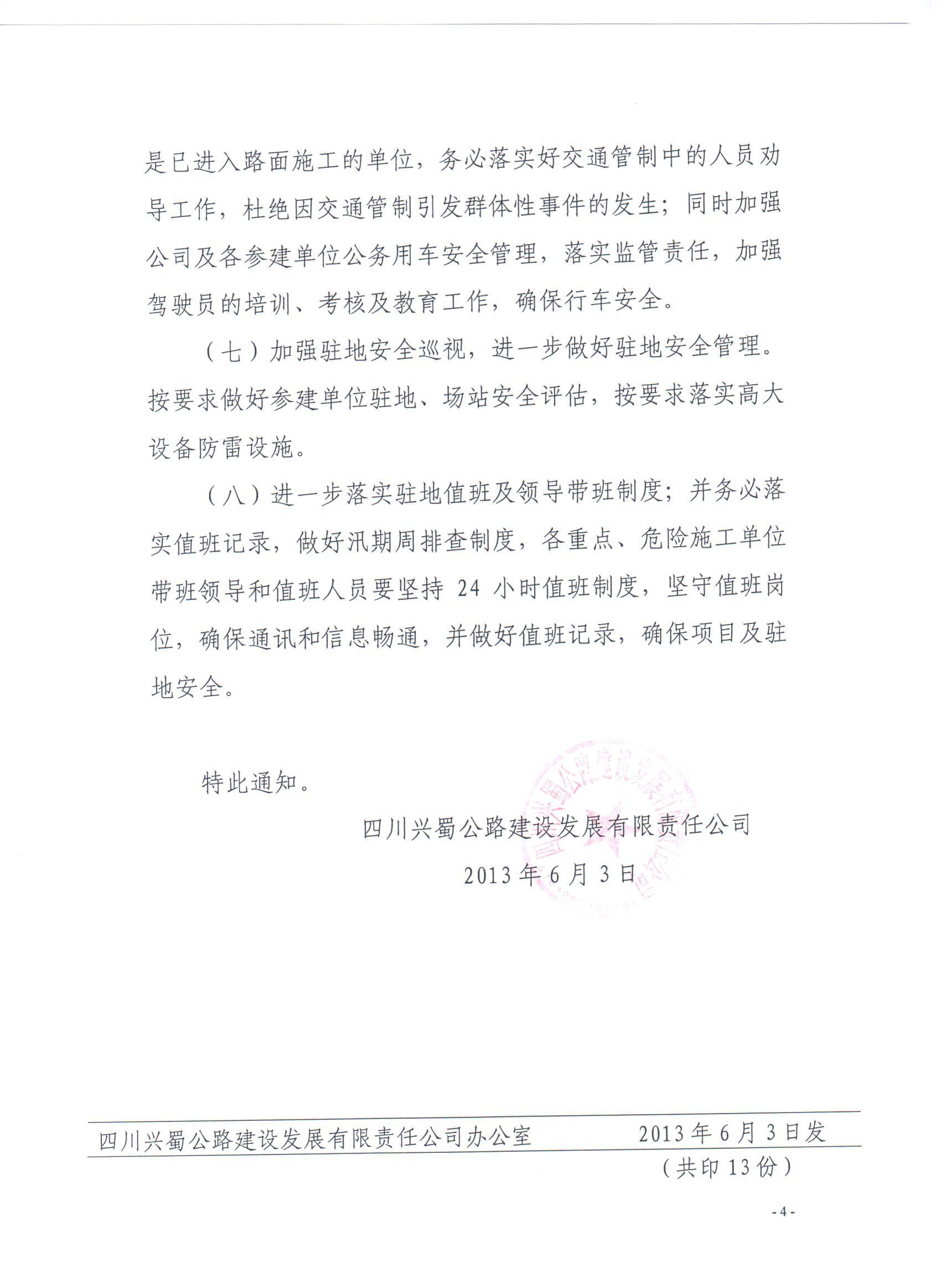 (六)加強交通安全管理,確保道路暢通及行車安全。進一步加強施工路段交通疏導,做好保通、保暢工作。特別是已進入路面施工的單位,務必落實好交通管制中的人員勸導工作,杜絕因交通管制引發群體性事件的發生;同時加強公司及各參建單位公務用車安全管理,落實監管責任,加強駕駛員的培訓、考核及教育工作,確保行車安全。