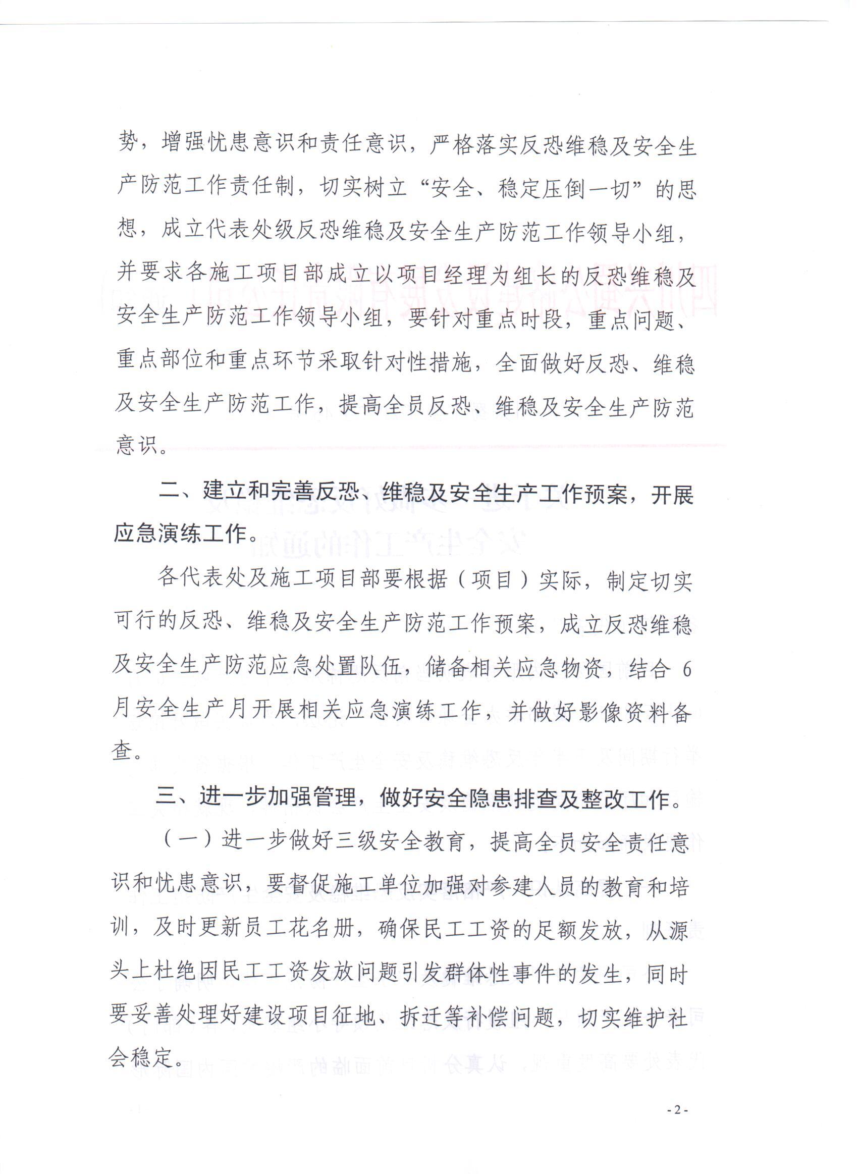 公司高度重視反恐維穩及安全生產防范工作,明確了公司安全生產領導小組履行反恐維穩領導小組職責,各(部門)代表處要高度重視,認真分析目前面臨的嚴峻的國內國際形勢,增強憂患意識和責任意識,嚴格落實反恐維穩及安全生產防范工作責任制,切實樹立“安全、穩定壓倒一切”的思想,成立代表處級反恐維穩及安全生產防范工作領導小組,并要求各施工項目部成立以項目經理為組長的反恐維穩及安全生產防范工作領導小組,要針對重點時段,重點問題、重點部位和重點環節采取針對性措施,全面做好反恐、維穩及安全生產防范工作,提高全員反恐、維穩及安全生產防范意識。