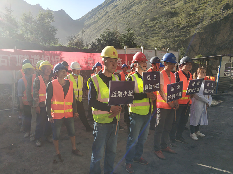 此次演練主要模擬上石門隧道出口后方3米處突發坍塌事故,4名作業人員被困塌方體的險情。為確保本次演練有序進行,迭瑪路指揮部成立以項目經理為總指揮,應急搶險、保衛協助、醫療救護、后勤保障等小組組成應急救援隊,配備機械設備4臺,投入救援人員30人。險情發生后,巡查安全員立即撥打120、組織人員撤離,項目部啟動應急救援預案,在各應急救援小組的協同配合下,受傷人員被成功救出,演練取得圓滿成功。