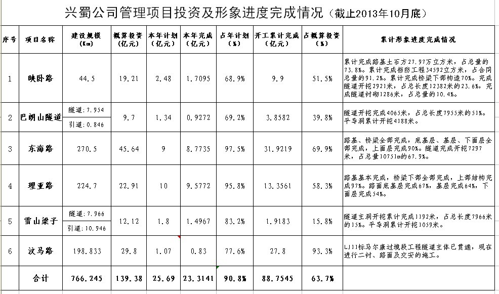 公司管理項目投資及形象進度完成情況(截止2013年10月底)