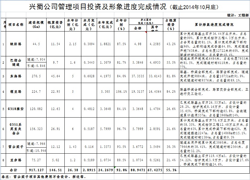 公司管理項目投資及形象進度完成情況(截止2014年10月底)