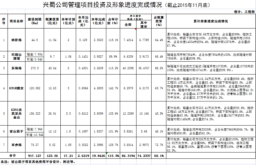 興蜀公司管理項目投資及形象進度完成情況(截止2015年11月底)
