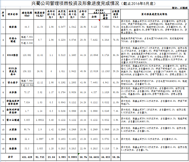 興蜀公司管理項(xiàng)目投資及形象進(jìn)度完成情況(截止2016年5月底)