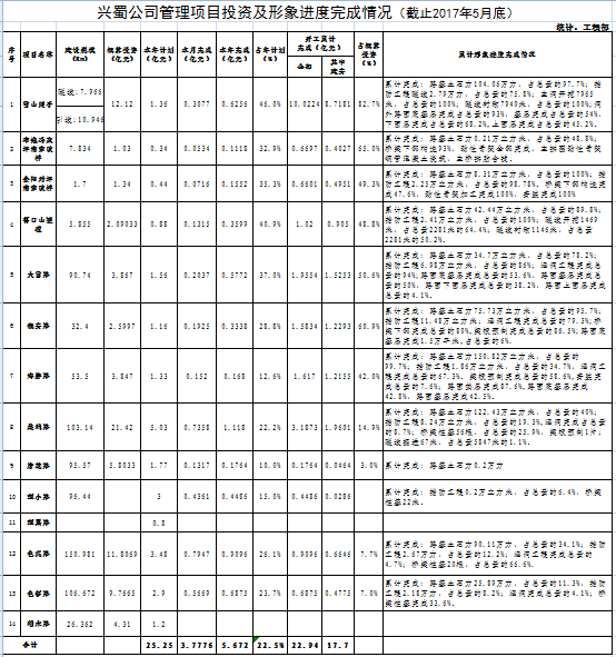 興蜀公司管理項目投資及形象進度完成情況(截止2017年5月底)