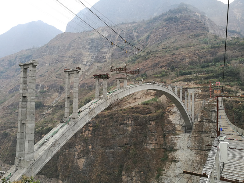 布拖馮家坪金沙江溜索改橋項目坐落在“亞洲第一高溜”鸚哥溜索下游500米的金沙江上,距金沙江水平面276米,橋梁基礎兩岸山體坡角為70~80°,地勢十分險要。加之峽谷季風性氣候,風力時常達到七八級,使箱梁吊裝要同時經受住高空、大風的多重考驗。為確保箱梁工作安全進行,興蜀公司布拖金沙江溜索改橋指揮部多次組織各參建單位討論吊裝安全方案,對吊裝時間、運梁線路、臨時支座安裝、履帶吊站位、箱梁運行、落梁等工作做了詳細的安排部署,保證吊裝工作始終可控。拱上箱梁吊裝工作計劃在2月底前結束。