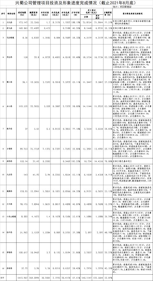 興蜀公司管理項目投資及形象進度完成情況(截至2021年8月底)