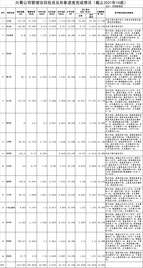 興蜀公司管理項(xiàng)目投資及形象進(jìn)度完成情況(截至2021年10月底)