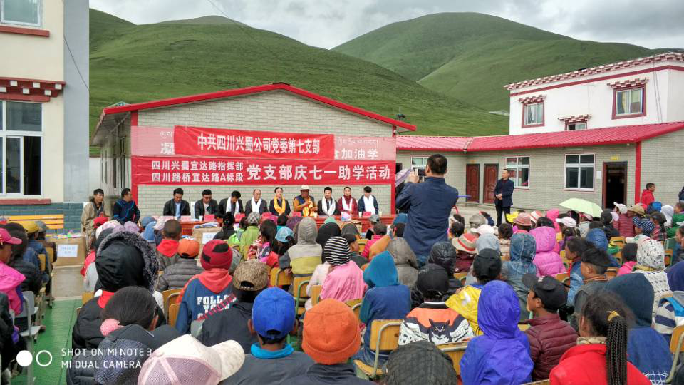 2018年7月1日,在中國共產黨建黨97周年之際,公司第七黨支部會同四川路橋宜達路黨支部、鎮江路橋宜達路黨支部到石渠縣阿日扎鎮中心校開展慶“七一”愛心助學活動,為鎮中心校、麻曲村小捐贈了助學資金5000元和價值2萬元的書包、文具、籃球等文體用品。興蜀公司副總經理潘華同志表達了對全體小朋友的殷切希望和對全體教職工的謝意,勉勵小朋友好好學習、天天向上,將來回報社會、報效祖國。鎮黨委書記降擁代表鎮政府、鎮中心校和麻曲村小全體師生向興蜀公司和路橋公司表達了最真誠的謝意,感謝他們對阿日扎公路建設和牧區教育的無私奉獻。