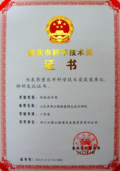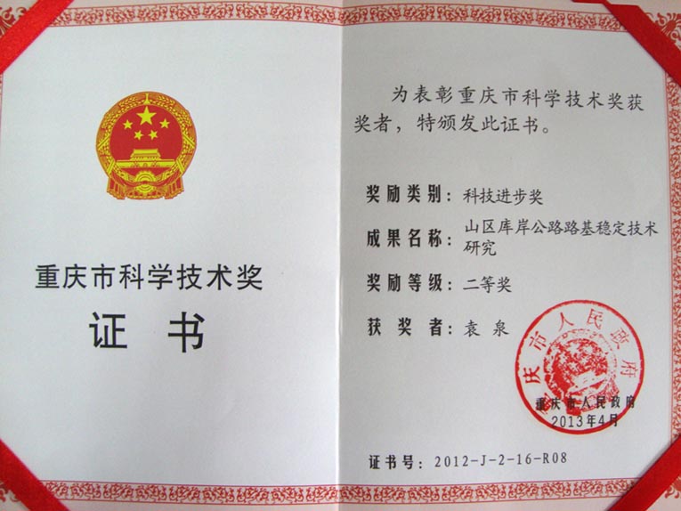 日前,我公司科研課題《山區(qū)庫岸公路路基穩(wěn)定技術研究》,榮獲重慶市人民政府2012年度“重慶市科技進步獎”二等獎。柯勇總經理、袁泉總工程師分獲個人二等獎。